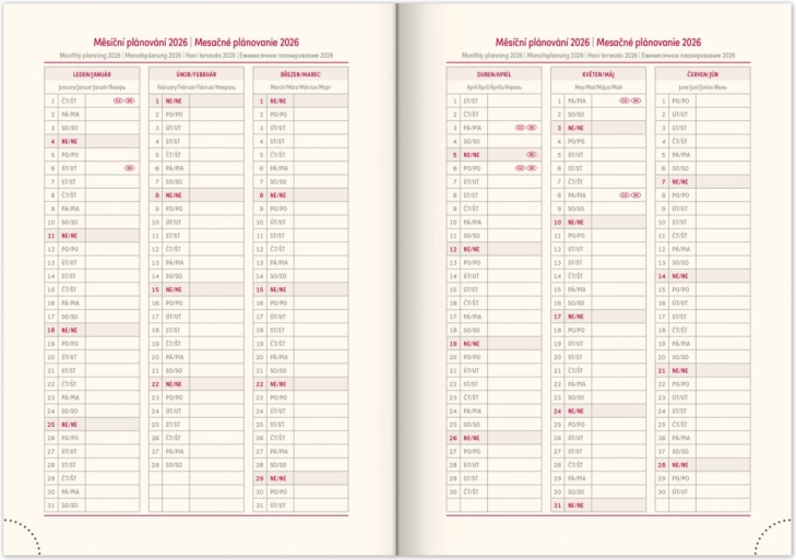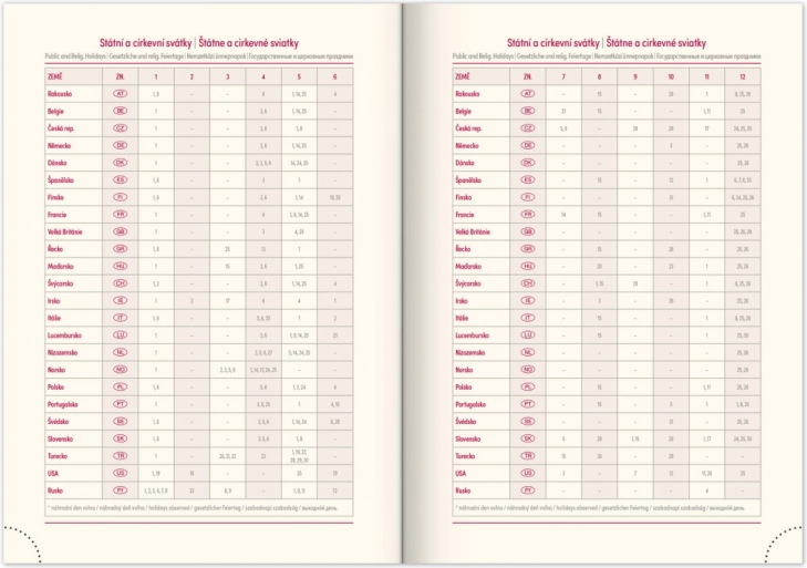 Nowoczesny design ze stałą gumką i pętlą na długopis. Zawiera kalendarium czesko-słowackie oraz dodatki w języku angielskim, niemieckim, węgierskim i rosyjskim.