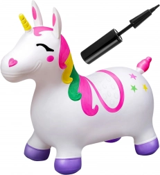 Przynieś do domu magiczny świat fantazji z dmuchanym skaczącym jednorożcem. Jest wykonany z bezpiecznych i trwałych materiałów i posiada wygodne uchwyty do bezpiecznego skakania. Produkt jest odpowiedni dla dzieci od 12 miesięcy, a maksymalne obciążenie wynosi 45 kg. Dzięki swojemu wyjątkowemu designowi i szerokiej podstawie z antypoślizgowymi nóżkami zapewnia stabilność i bezpieczeństwo.
