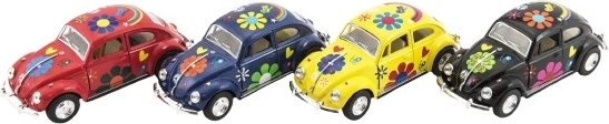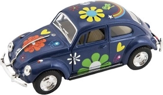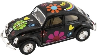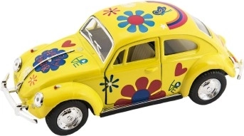 Przenieś się do złotej ery motoryzacji z dopracowanym modelem KINSMART VOLKSWAGEN Beetle. Ten metalowy model o długości 13 cm zachwyca jakością wykonania, barwnymi kwiatowymi motywami i realistycznymi detalami, które ucieszą dzieci i dorosłych kolekcjonerów.