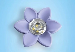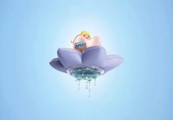 Kwiat pływa na wodzie a jego przezroczysty pączek wypełnia się wodą. Z efektem deszczu, wirującym pyłem wróżek i okienkiem do oglądania dna wanny.