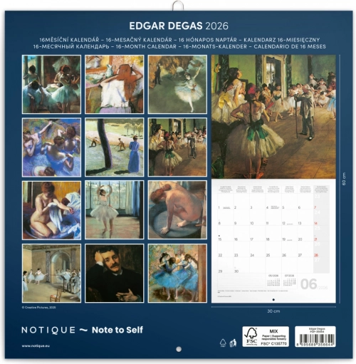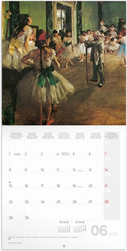 Kalendarz notatkowy Edgar Degas 2026 oferuje dwanaście mistrzowskich dzieł Edgara Degasa z przejrzystym kalendarium, miejscem na notatki i ważnymi świętami.