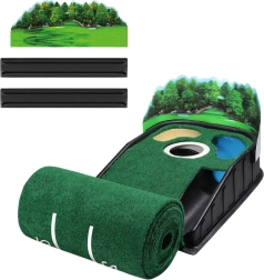 W zestawie znajdują się również boczne barierki, które zapobiegają wypadaniu piłek, oraz realistyczna grafika z motywem pola golfowego. Produkt wykonany jest z wysokiej jakości syntetycznego materiału, który odwzorowuje prawdziwą nawierzchnię trawiastą i zapewnia właściwy opór podczas ruchu piłki.