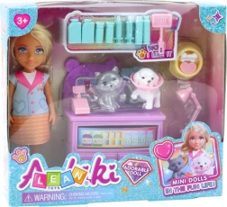 Poznaj świat opieki weterynaryjnej z mini lalką, która ma zaledwie 13 cm. Ubrana w stylowy strój obejmujący sportowe buty i bluzkę z napisem 'Pet', podbije serca dzieci od pierwszego wejrzenia. Realistyczne dodatki obejmują także pieska i kotka, którzy potrzebują pomocy, oraz lekarską szafkę z wieloma akcesoriami.