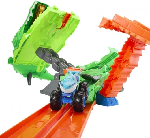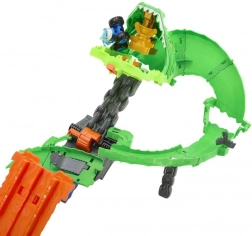 Rozkręć adrenalinowy pojedynek w tematycznym zestawie „Rekiny vs. Dinozaury: Smoczy wyścig”. Umieść oba trucki w podwójnej wyrzutni i puść je równoległym wyścigiem prosto w paszczę cybernetycznego smoka. O wszystkim zadecyduje zwrotnica w kształcie piły, która losowo określi, czy pojazdy się zatrzymają, jeden wypadnie z toru, czy oba przelecą i strącą smoka na ziemię.