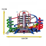 W zestawie znajduje się także 6 metalowych autek i pociąg zasilany bateriami, automatyczne rozjazdy, tunel z funkcją kraksy oraz 2 zmotoryzowane windy. Wymiary po złożeniu: 128 × 78 × 73 cm.