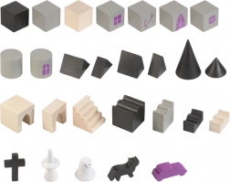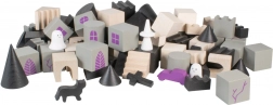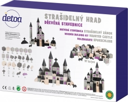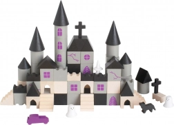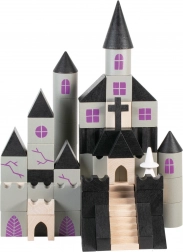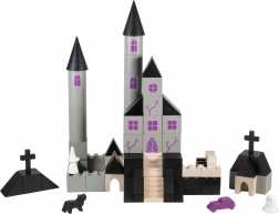 Drewniane klocki konstrukcyjne Straszny zamek wprowadzają do dziecięcego świata odrobinę magii i tajemnicy. Każdy z 97 elementów jest z nadrukiem oraz ma różne kształty i rozmiary, co umożliwia nieograniczone możliwości podczas budowy zamku.