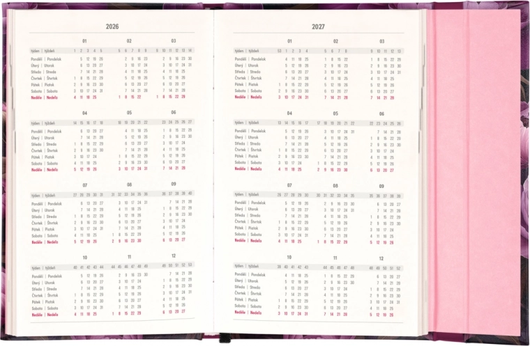 Terminarz Notique Fioletowe kwiaty jest nie tylko estetycznie przyjemny, ale także bardzo funkcjonalny. Zawiera miesięczne przeglądy, które są idealne do planowania urlopów lub wakacji. Dodatkowo obejmuje listę czeskich i słowackich świąt oraz imienin, co pomoże Ci być zawsze przygotowanym.