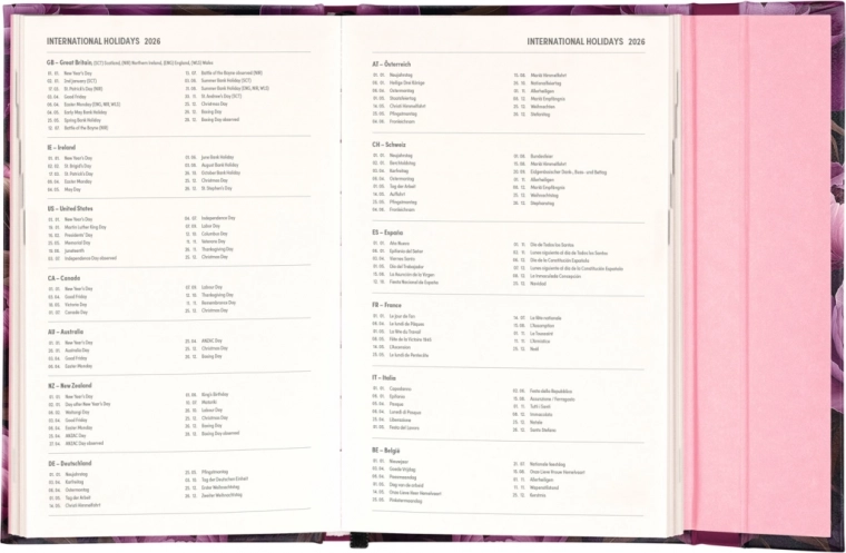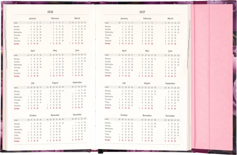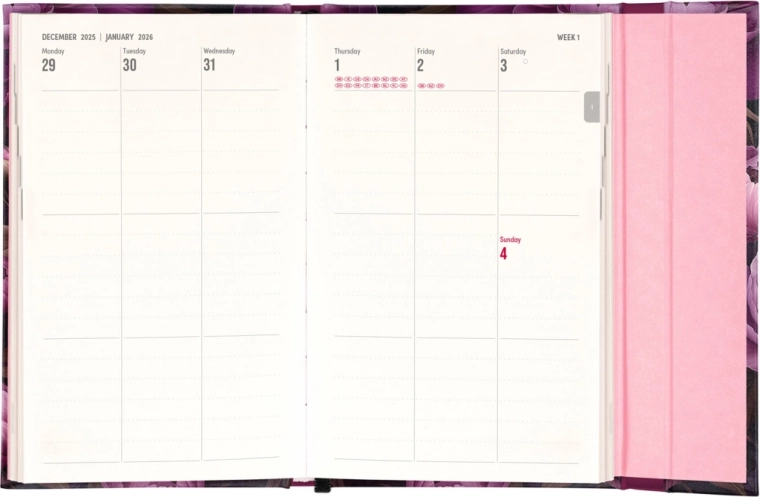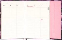 Zawiera także miesięczne przeglądy, idealne do planowania urlopów lub wakacji. Terminarz jest nie tylko praktyczny, ale dzięki wzorowi z motywem fioletowych kwiatów stanowi również stylowy dodatek do Twojego biurka.