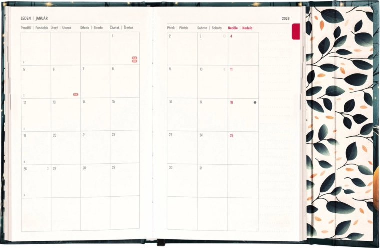 Wyposażony jest w miesięczne przeglądy, które umożliwiają łatwiejsze planowanie dłuższych okresów, takich jak urlopy czy ferie szkolne. Ten terminarz zawiera także listę czeskich i słowackich świąt oraz imienin, co pozwala lepiej organizować czas wolny.
