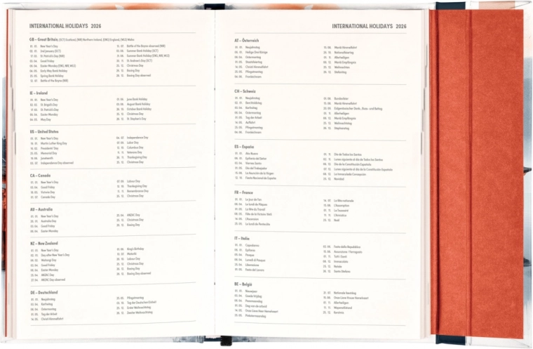 Tygodniowy terminarz z międzynarodowymi świętami i magnetycznym zamknięciem jest idealny dla wszystkich, którzy chcą mieć przejrzyste plany dzięki dużej ilości miejsca na notatki.