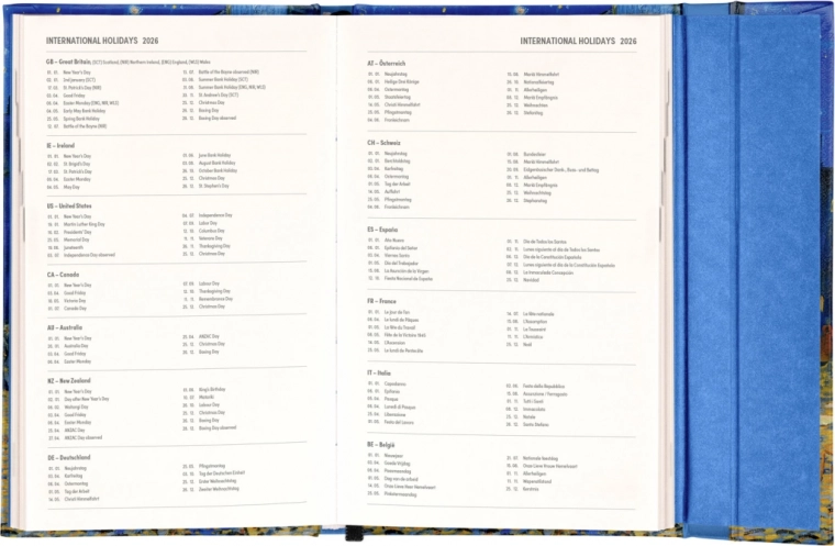 Terminarz jest dostępny w rozmiarze 13 x 21 cm, co stanowi idealny format do torby lub plecaka. Zawiera także międzynarodowe święta, co jest przydatne dla użytkowników, którzy często podróżują lub mają międzynarodowych klientów.