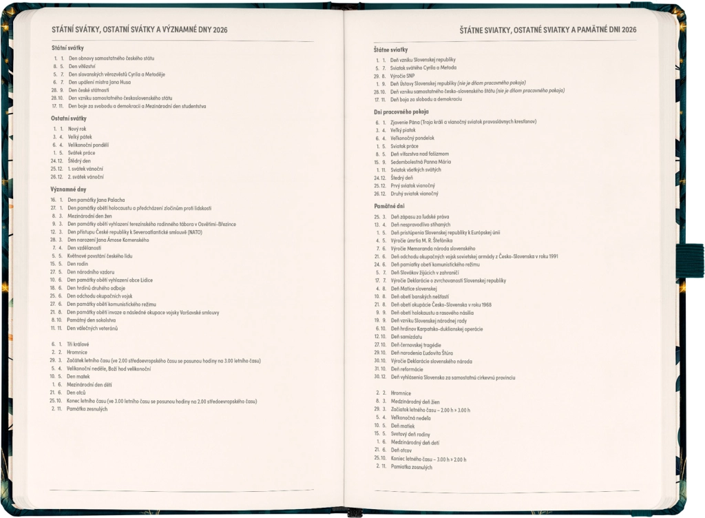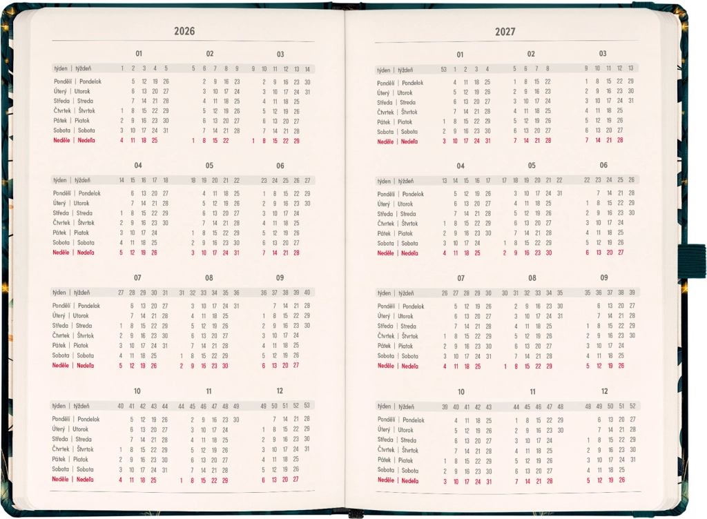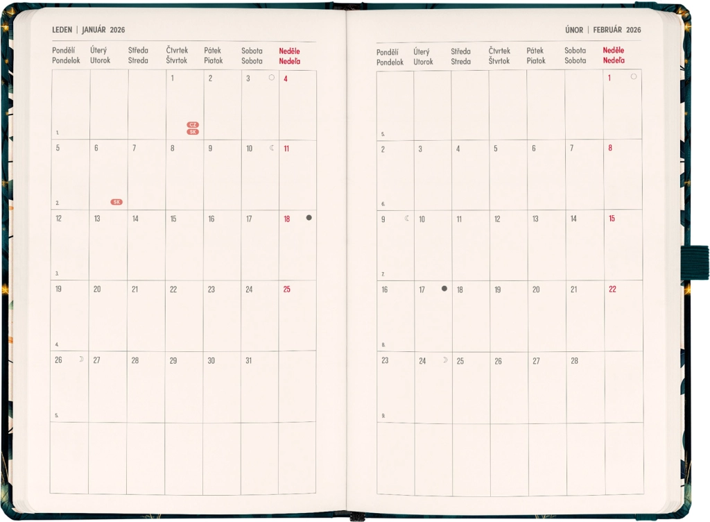 Skorzystaj z idealnego połączenia kalendarza i notesu dzięki PLANBOOK. Pierwsza połowa zawiera czternastodniowy horyzontalny układ kalendarium z czeskimi i słowackimi świętami, który pomoże ci planować każdy dzień z dbałością o szczegóły. Druga połowa składająca się z liniowanych stron jest doskonała do zapisywania wszystkich twoich notatek, myśli lub projektów.
