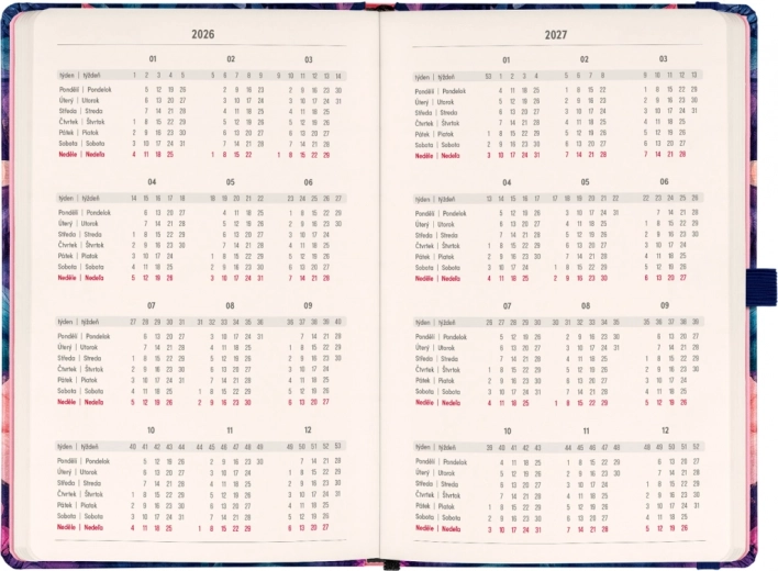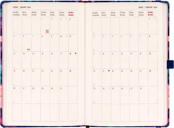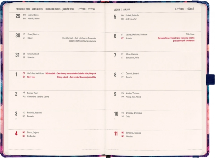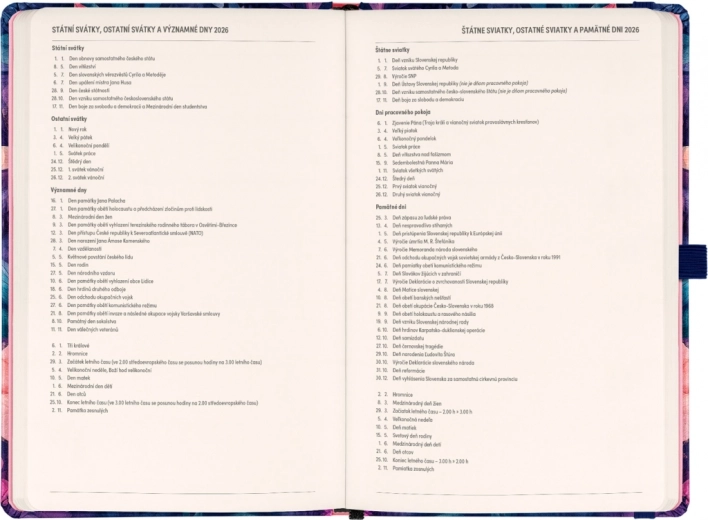- Dwutygodniowym horyzontalnym kalendarium z czeskimi i słowackimi świętami dla przejrzystego planowania.