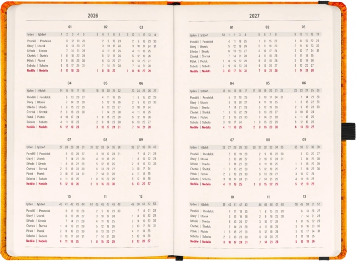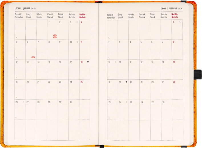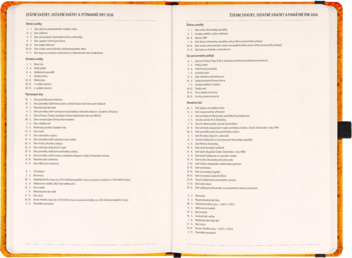 - Dwutygodniowe horyzontalne kalendarium z czeskimi i słowackimi świętami dla łatwego planowania.