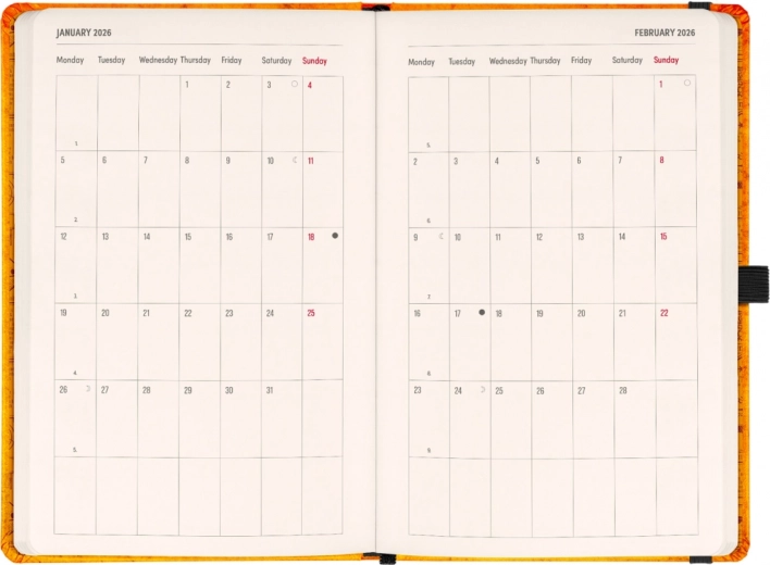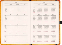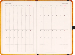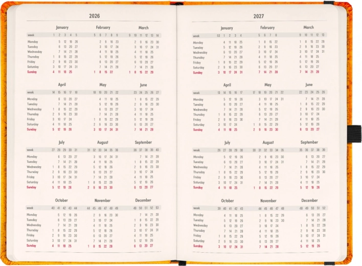 - Pierwsza połowa zawiera dwutygodniowe, horyzontalne kalendarium z międzynarodowymi świętami.