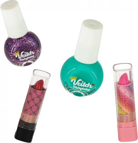 Zawiera szeroką gamę produktów do makijażu i upiększania, w tym cienie do powiek, pomadki i lakiery do paznokci.