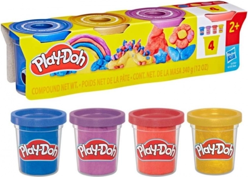 Uzupełnij swoją kolekcję Play-Doh metalicznym zestawem 4 kubeczków; wyraziste kolory i tekstury dla kreatywności dzieci.