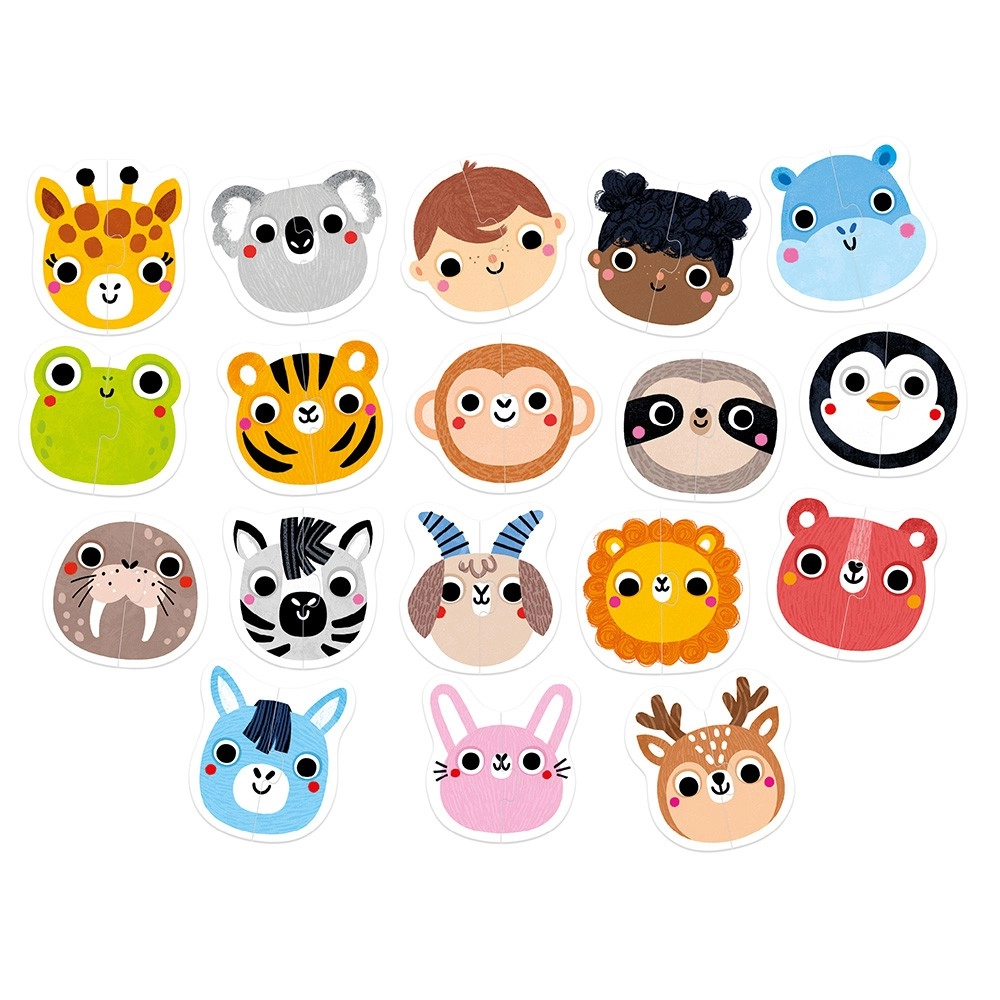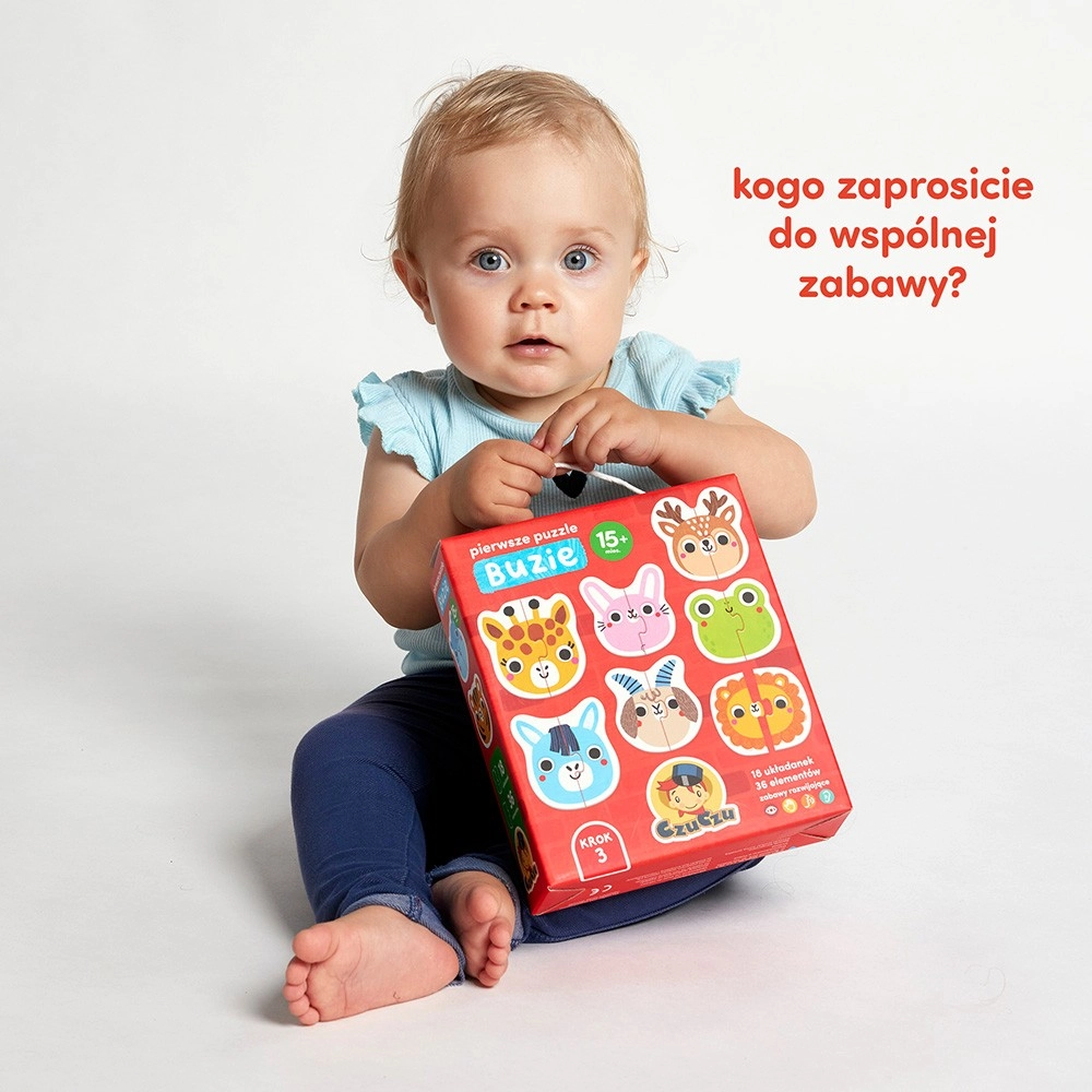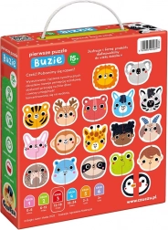 Co znajdziesz w pudełku? Aż 18 dwuelementowych puzzli z buziami zwierząt i 2 dziecięcymi buziami, co daje maluchom wiele możliwości wesołej zabawy!