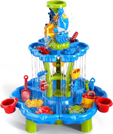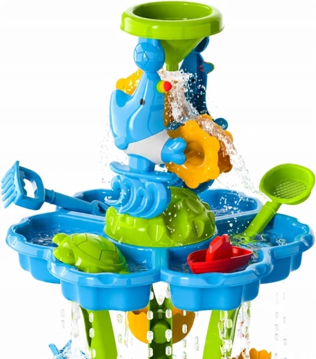 Stwórz dzieciom ich własny mini aquapark. Stolik oferuje trzy niezależne komory – jedną możesz napełnić wodą, drugą piaskiem, a trzecią przeznaczyć na mieszanie i eksperymenty. Woda spływa przez kaskadowe rynny, napędza koła i przelewa się przez bramki, dzięki czemu dzieci widzą wyraźne związki przyczynowo-skutkowe i rozwijają małą motorykę.