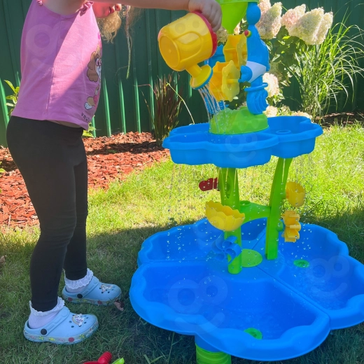 Woda spływa przez kilka poziomów, napędza koła i tworzy mini wodospady, które fascynują dzieci i uczą je zależności przyczynowo-skutkowych.