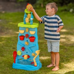 Montaż jest szybki i bez użycia narzędzi. W komplecie bogate akcesoria: łopatki, grabki, sita, konewka, wiaderko, foremki i kubeczki na wodę. Zabawka wspiera percepcję sensoryczną, myślenie logiczne oraz rozwiązywanie problemów, i to wszystko w formie radosnych eksperymentów.