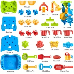 2× łopatka, grabki, 2× sito, konewka, wiaderko, 4× foremka, 5× kubeczek na wodę, 10× koło wodne, podwójne koło wodne z lejkiem, 3× rynienka