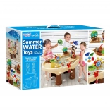Zestaw zawiera piracką wieżę z bocianim gniazdem, figurkę pirata, kotwicę, kubeczki do przelewania oraz pływające zwierzątka, które wspierają zabawę sensoryczną, koordynację ręka–oko i kreatywność. Duża przestrzeń umożliwia wygodną, wspólną zabawę kilku dzieci, a prosta konstrukcja ułatwia opróżnianie wody i pielęgnację.