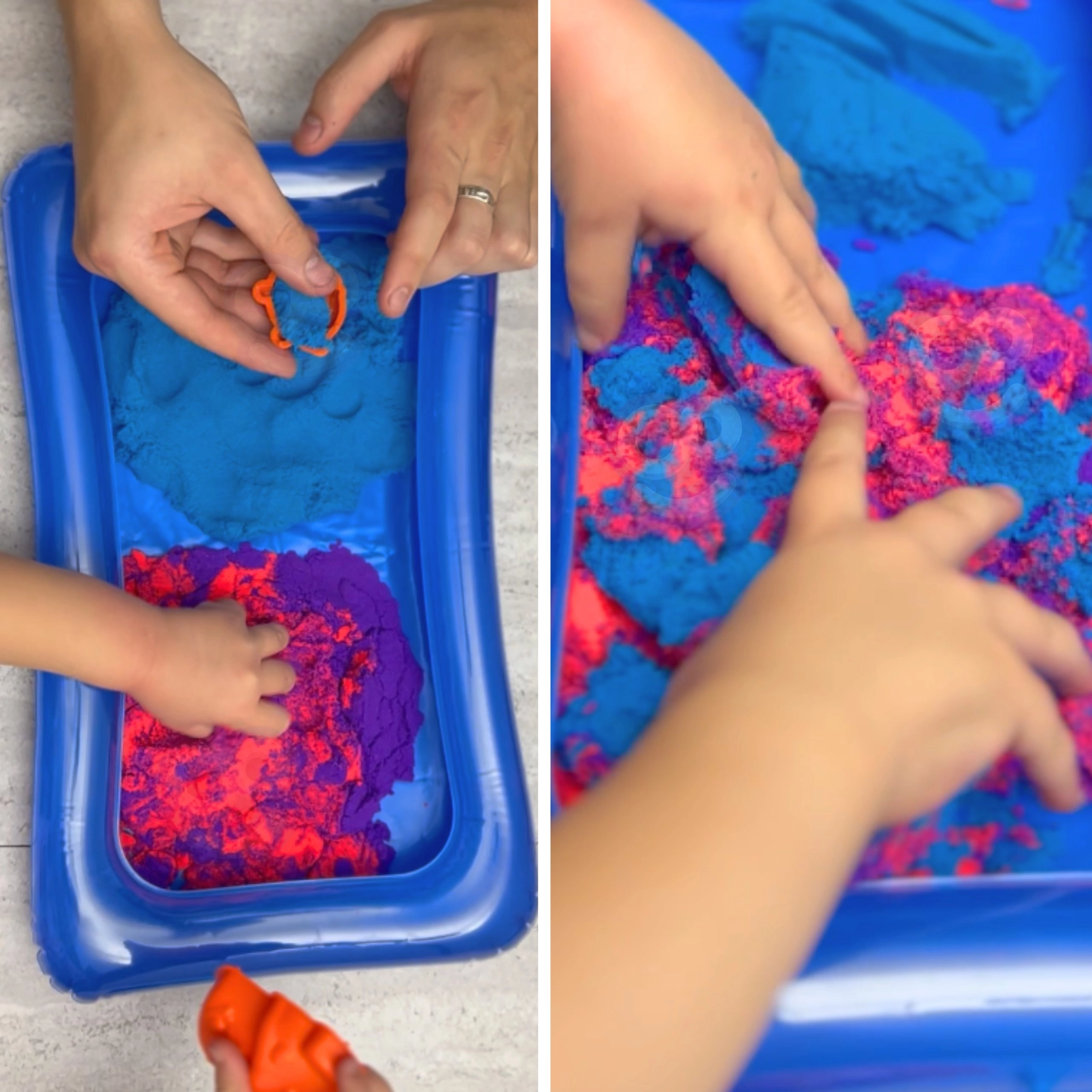 Kompaktowa, nadmuchiwana tacka utrzymuje piasek w jednym miejscu, więc dzieci mogą tworzyć bez bałaganu na podłodze czy stole.
