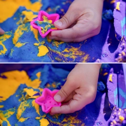 Dzieci mogą ugniatać, kroić i formować piasek w gwiazdki i inne kształty. Świetne do zabaw sensorycznych i rozwoju małej motoryki.