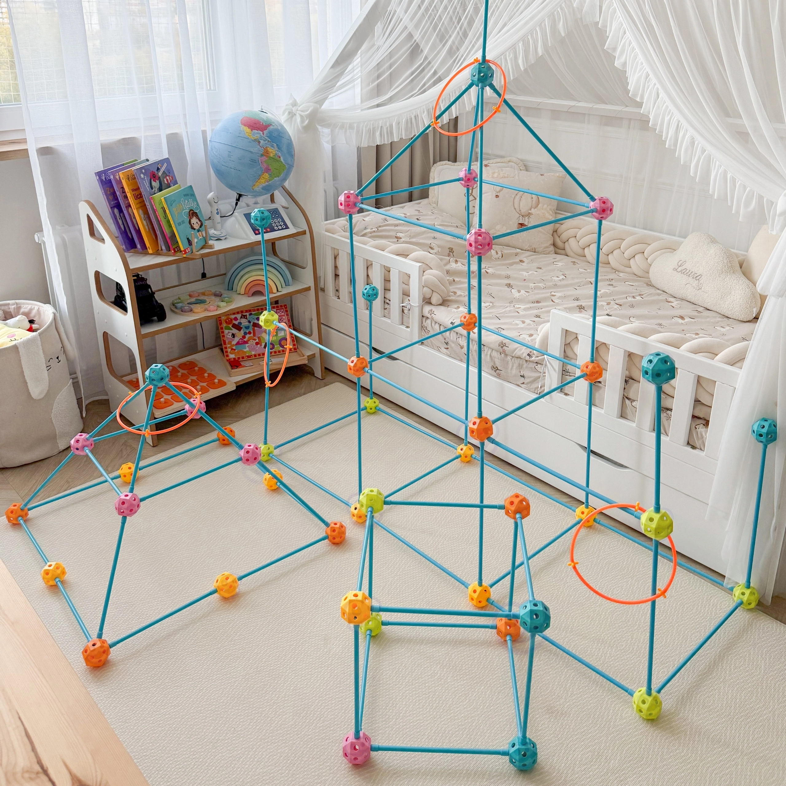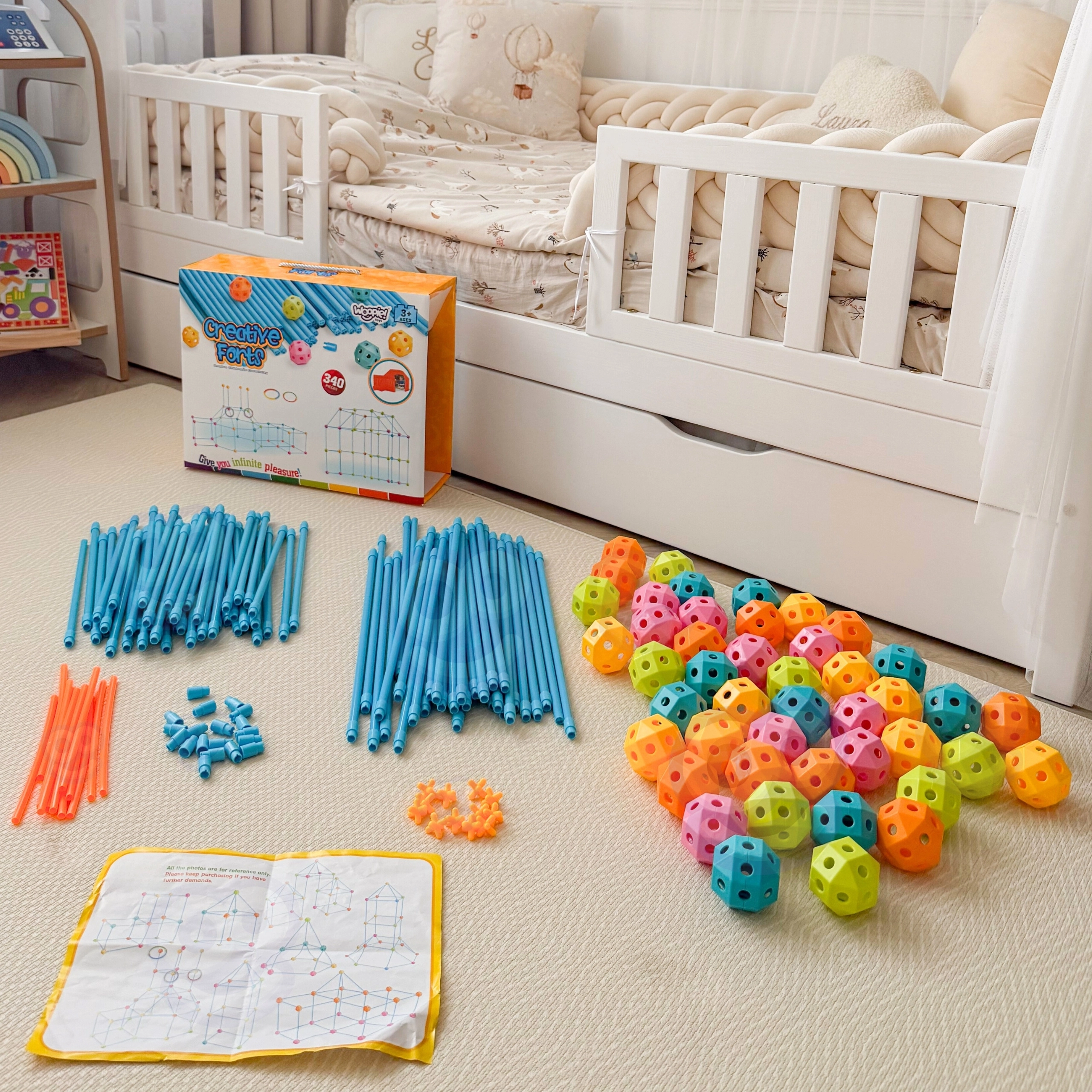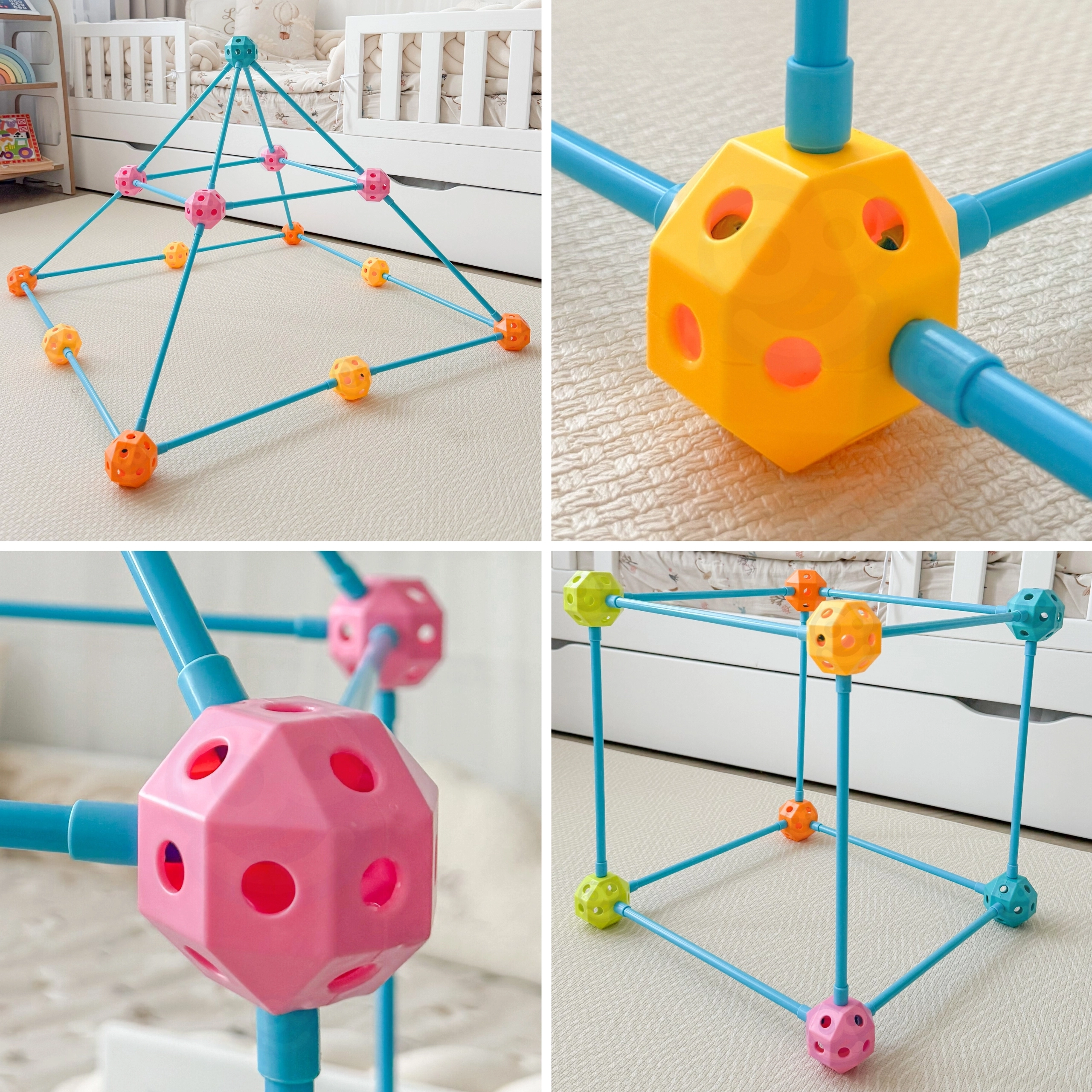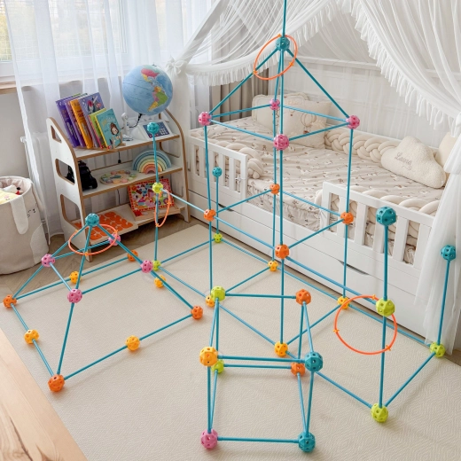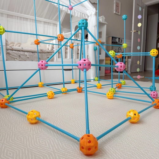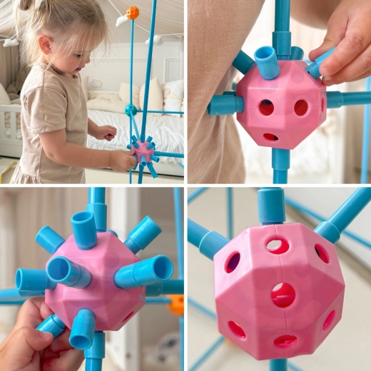 Długie pręty i kulki z wieloma otworami zapewniają stabilne połączenia pod różnymi kątami. Dzieci łatwo tworzą wieże, kopuły, domki i labirynty.