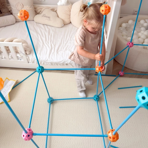 Lekkie, gładkie i wytrzymałe elementy zaprojektowano z myślą o małych dłoniach, bez ostrych krawędzi i z szybkim, intuicyjnym łączeniem. Wspólne budowanie rozwija pracę zespołową, cierpliwość i wyobraźnię przestrzenną, a jednocześnie uczy podstaw geometrii i inżynierii.