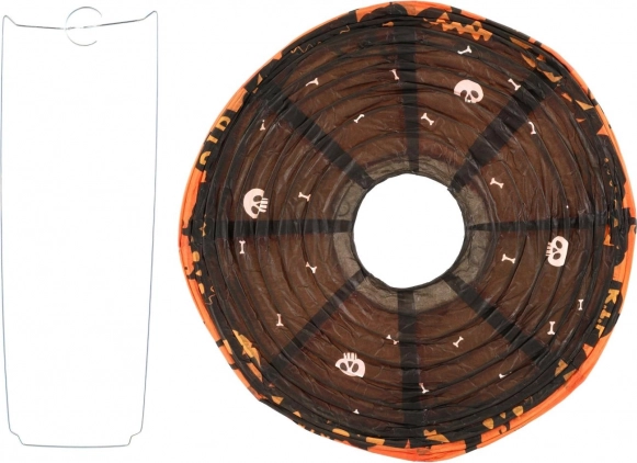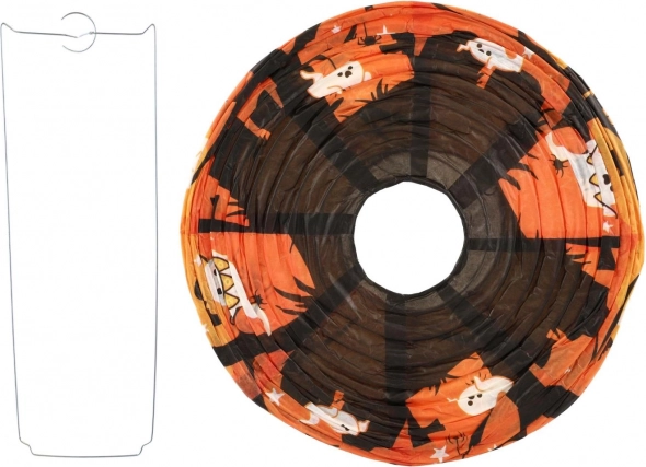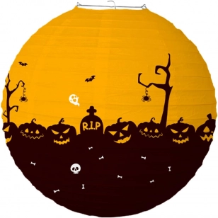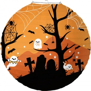 Dodaj swojej halloweenowej dekoracji odpowiedni nastrój dzięki okrągłemu papierowemu lampionowi o średnicy 30 cm. Dzięki lekkiej konstrukcji, łatwemu zawieszaniu oraz strasznym motywom takim jak dynie, duchy, nietoperze i cmentarze w mgnieniu oka stworzy nastrojowe oświetlenie na imprezę i do okien.