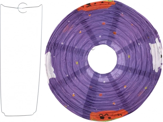Ten dekoracyjny lampion idealnie sprawdzi się na halloweenowych przyjęciach, do dekoracji pokoju dziecięcego, ogrodu czy witryn. Okrągły kształt, wyraziste pomarańczowe i fioletowe tony oraz motywy znane z Halloween zapewniają natychmiastowy efekt. Dzięki metalowemu haczykowi i wewnętrznemu stelażowi łatwo się go składa i zawiesza.