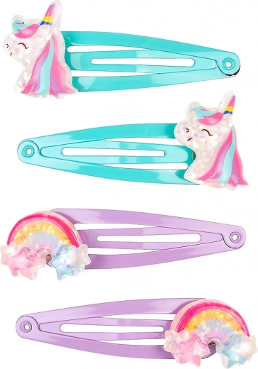 Zestaw czterech błyszczących spinek z motywami jednorożca i tęczy wnosi do dziecięcych fryzur magiczny akcent, idealny dla małych miłośniczek fantazji.