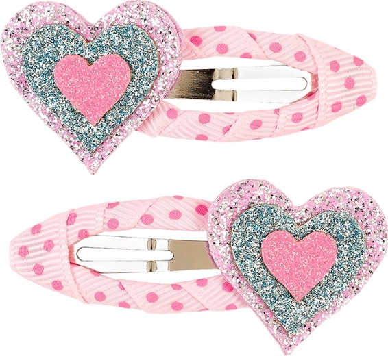 Uroczy zestaw dwóch spinek do włosów, ozdobiony motywem serduszek, przyniesie czar do każdej dziecięcej fryzury. Metalowa część spinaków jest starannie owinięta tasiemką rypsową, co zapewnia ich elegancki wygląd i bezpieczeństwo noszenia.