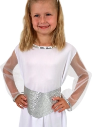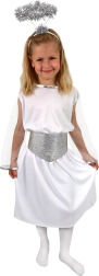 Dziecięcy kostium Anioł z aureolą i paskiem to doskonały wybór na karnawał lub przyjęcia tematyczne. Kostium obejmuje aureolę, pasek i sukienkę. Wykonany w srebrno-białej kolorystyce, która nadaje poczucie czystości i elegancji.