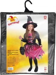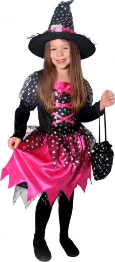 Magiczny kostium karnawałowy dla małych czarownic! Czarno-różowy kostium jest idealny dla dziewczynek w wieku 6–8 lat, wzrost 117–128 cm. Wyróżnia się różowymi wstążkami i srebrnymi gwiazdkami.