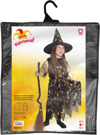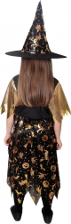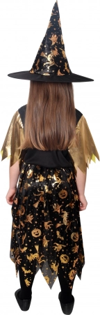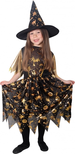 Kostium halloweenowy dla małej czarownicy! Kostium w czarno‑złotym kolorze jest idealny dla dziewczynek w wieku 6–8 lat. Złote motywy halloweenowe czynią tę sukienkę nieodparcie uroczą. W zestawie perfekcyjnie dopasowany kapelusz czarownicy.