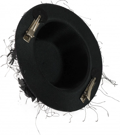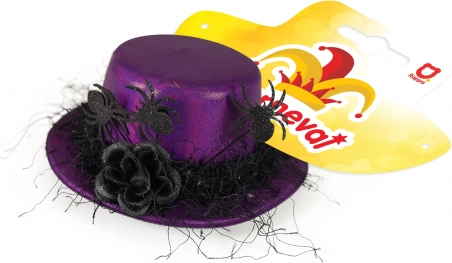 Elegancki mini kapelusz w przykuwającym uwagę fioletowym kolorze z czarnym kwiatem i pajączkami stanowi wyjątkowy dodatek do każdego stroju.