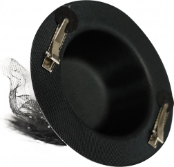 Elegancki srebrny minikapelusz z czarną wstążką, piórami i tiulem, ozdobiony biżuterią, doda Twojej fryzurze szyku. Łatwo się mocuje dzięki dwóm spinkom zapewniającym bezpieczne noszenie.