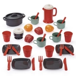 - Talerze, sztućce, szklanki, kubki, czajnik z pokrywką, garnek z pokrywką, owoce