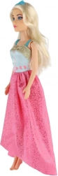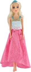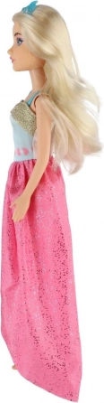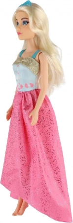 Długa różowa spódnica z połyskiem i kontrastowy niebieski gorset nadają lalce wyjątkowy wygląd – idealny na bal i pokaz mody.