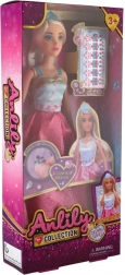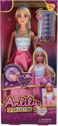 Lalka Anlily o wysokości 30 cm zachwyca elegancką, połyskującą suknią w odcieniach różu z detalami w kolorze niebieskim i złotym. Styl uzupełnia opaska oraz realistycznie wyglądające długie włosy, które zachęcają do czesania i stylizacji. W zestawie znajdują się także drobne, „diamentowe” ozdoby, które dodają zabawie nuty luksusu.