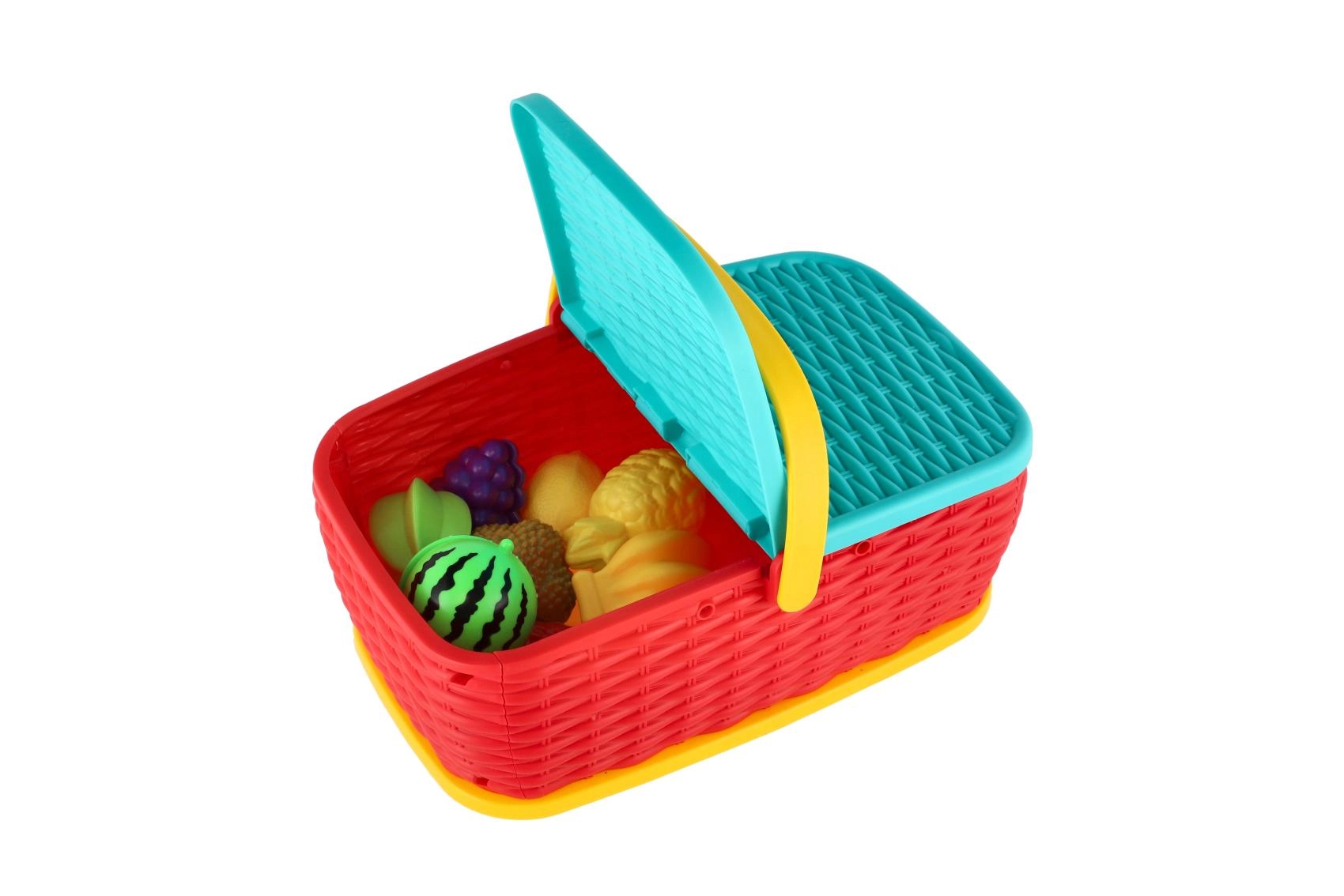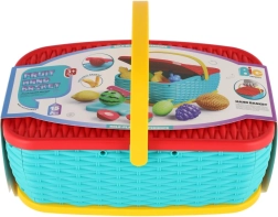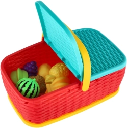 Hurra na piknik! Ten kolorowy plastikowy koszyk skrywa zestaw 15 elementów z owocami i warzywami, które dzieci mogą „kroić” bezpiecznym plastikowym nożykiem. Części są połączone rzepem, więc można je wielokrotnie rozdzielać i łączyć. Świetna zabawka do rozwoju małej motoryki, wyobraźni i zabaw w kucharza.