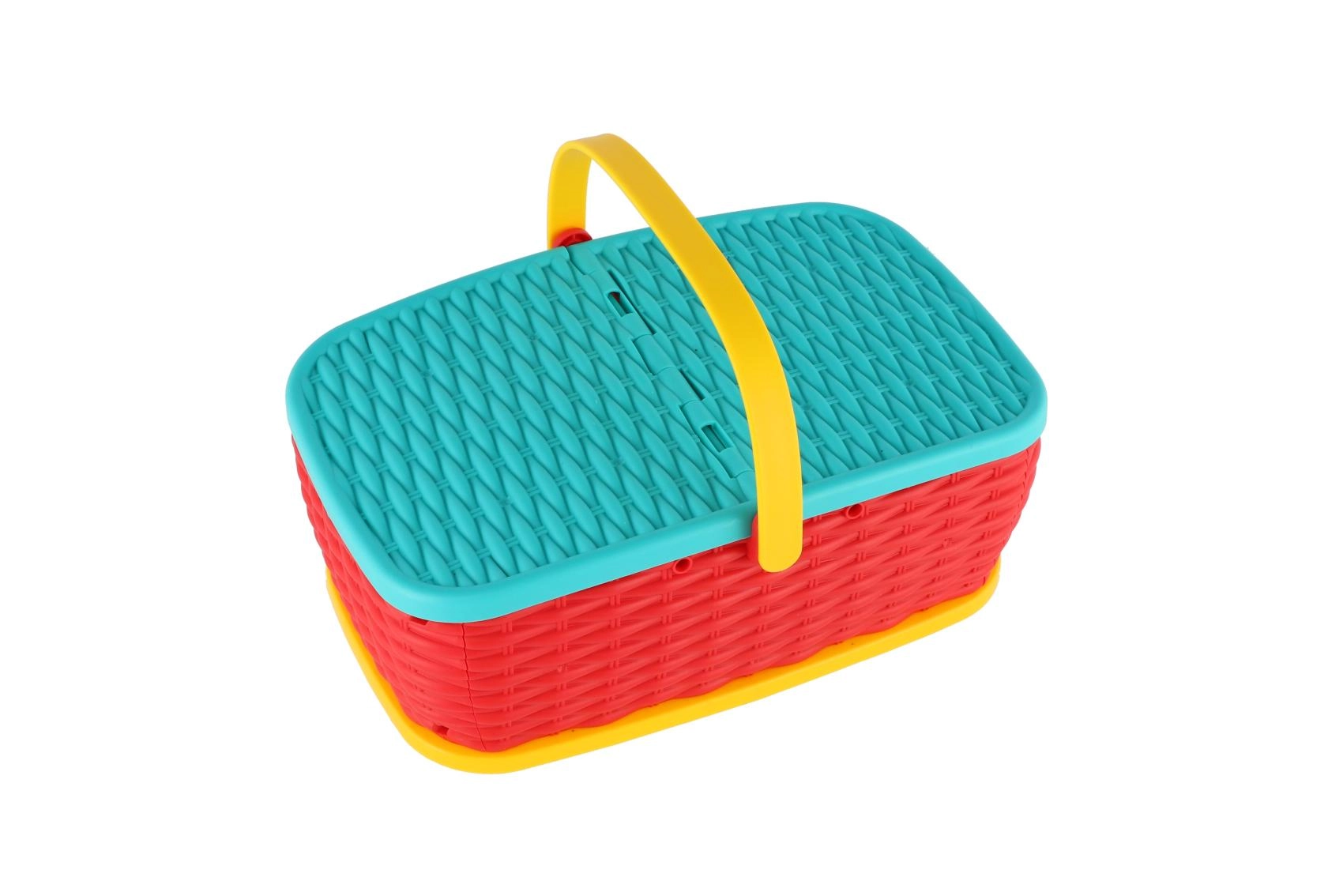 Lekki koszyk z pokrywką i składanym uchwytem trzyma wszystkie elementy razem. Łatwo go przenieść na piknik, do babci czy do pokoju dziecięcego.