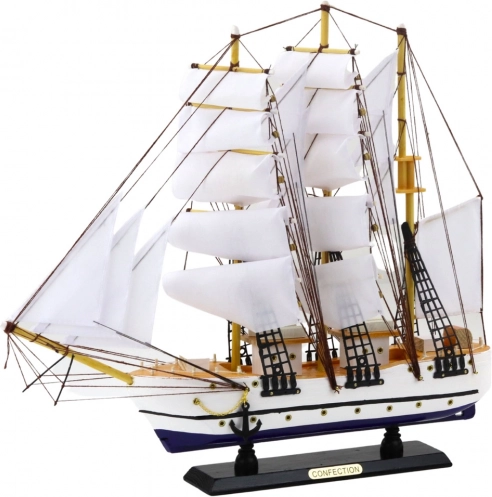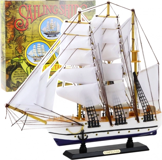 Wykonanie materiałowe obejmuje drewniany pokład, malowane burty oraz ręcznie naciągnięte liny i żagle. Statek umieszczony jest na czarnej podstawie z napisem „Confection”, co podkreśla jego ekspozycyjny charakter.