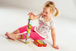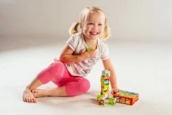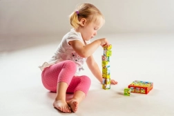 Zabawa klockami wspiera także rozwój poczucia równowagi podczas budowania wież oraz zrozumienia przyczyny i skutku podczas burzenia.