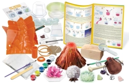 - model wulkanu, blok do wykopalisk z minerałami, narzędzia (dłutko, pędzelek, lupa), formy i miseczki, farby, materiały do krystalizacji, ilustrowana instrukcja