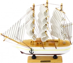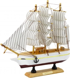 Ta replika jest wykonana z drewna i ręcznie wykończona, co gwarantuje jej autentyczność i wysoką jakość. Połączenie jasnego kadłuba oraz czarnych pasków na białych żaglach tworzy efektowny wizualny kontrast.