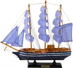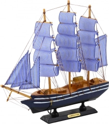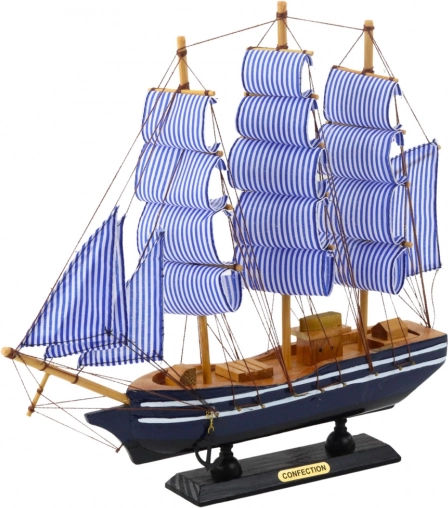 Ten dekoracyjny model trójmasztowej żaglówki z biało-niebieskimi, pasiastymi żaglami wykonany jest z wysokiej jakości drewna z tekstylnymi żaglami i dopracowanym olinowaniem. Elegancki biało-niebieski kadłub z czarną podstawką tworzy spójną estetyczną całość, która pasuje do stylowych wnętrz. Mimo klasycznych elementów nadaje pomieszczeniom nowoczesny i lekki charakter.